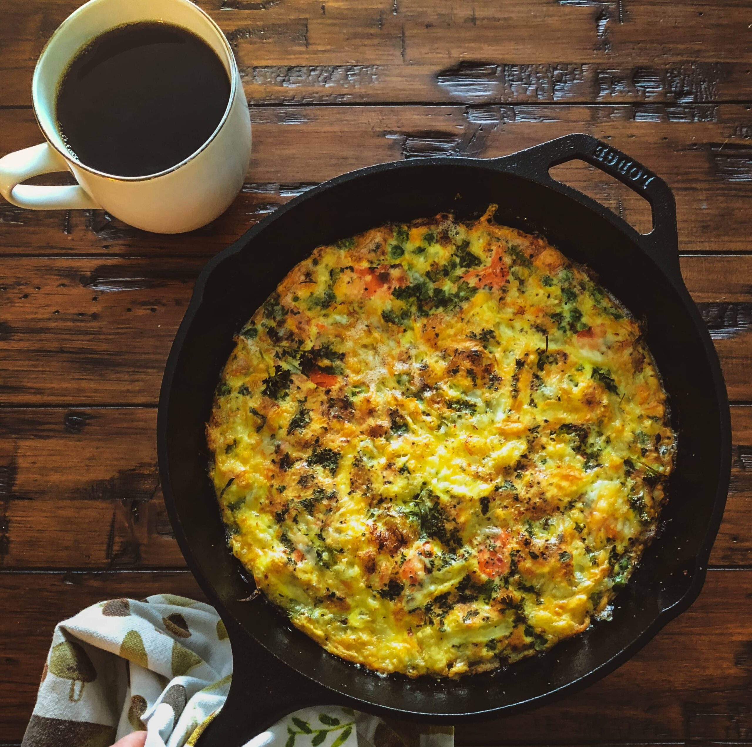 Place in oven and cook for 15-18 minutes depending on the size of the skillet. You’ll know when the frittata is done cooking when you press on the middle and it pushes back a bit.
